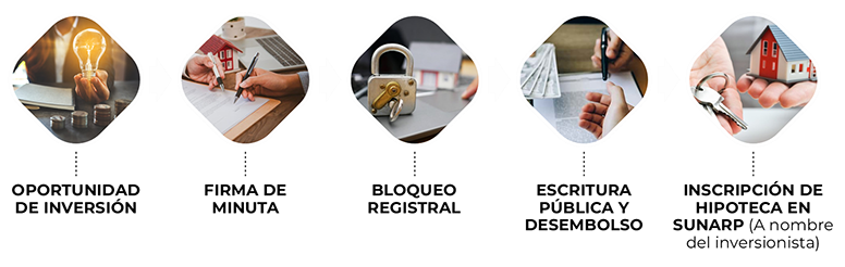 Inversión con garantía hipotecaria donde la garantía se inscribe en registros públicos como hipoteca a nombre del inversionista. Rentabilidad: Hasta 30% (TEA) en soles según el plazo de inversión. Garantía valorizada al triple de tu inversión. Plazo: 6, 12, 18, 24, 30 y 36 meses. Mínimo de inversión: S/. 20.000 Retorno mensual en cuotas fijas (capital + intereses) a partir del mes siguiente del desembolso.